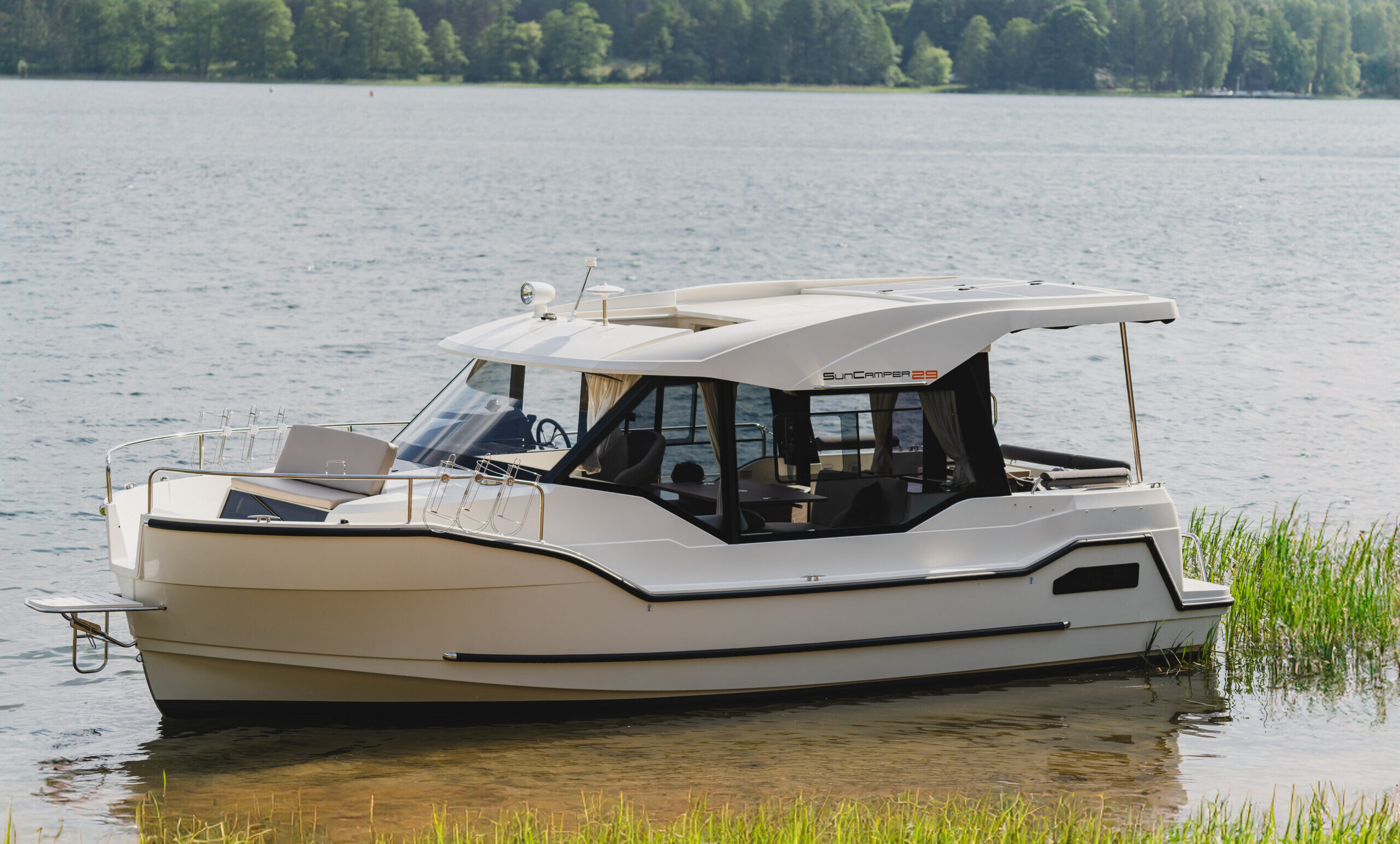 Napozóággyá alakítható vagy körbeülhető hosszú asztallal, hátul kényelmes napozófelületekkel és fürdőplatformmal, variálható napvédő biminivel, rengeteg tárolóval akár egész napos családi, baráti élményhajózást tesra is alkalmas a kategóriájukban egyedülálló 30 LE teljesítményű külmotorjának és az óriási 26 kWh akkumulátornak köszönhetően.